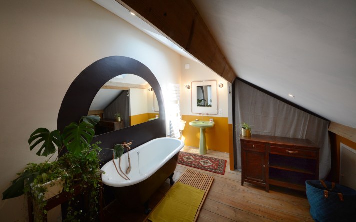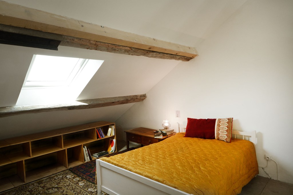 The studio is oriented to the East with 2 big windows. A cosy wooden stove keeps you warm for chilly nights. It measures 30 sqm with a double hight ceiling and a mezzanine. You will find tables, mirrors and furniture you can dispose at your leisure. The walls from the floor to the ceiling are at the entire disposal of the artists.