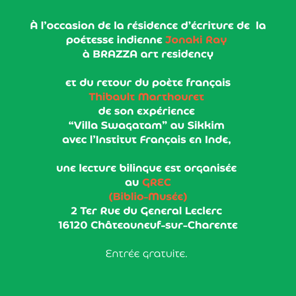 Poetry reading with Jonaki Ray and Thibault Marthouret.